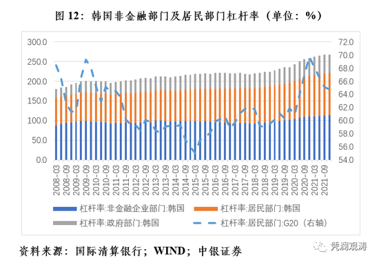 当然,韩国金融体系并非高枕无忧,家庭负债过多是其一大软肋。据国际清算银行统计,到去年底,韩国非金融部门杠杆率267.0%,与G20(二十国集团)成员平均266.4%基本持平。其中,韩国居民部门杠杆率106.4%,远高于G20成员64.4%的平均水平,在主要经济体中名列前茅。1998~2021年间,韩国居民部门杠杆率累计上升56.7个百分点,贡献了同期非金融杠杆率升幅的56.1%(见图12)。