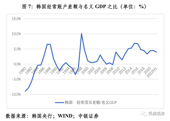 一是经常项目由逆差转为顺差。亚洲金融危机爆发前的1994~1996年,韩国经常项目持续逆差,与名义GDP之比平均为-1.8%,1997年为-1.2%。1998年以后,除2008年少量逆差外,其他年份均为顺差,2017~2021年与名义GDP之比平均为+4.3%,略超过+4%的国际合理标准。今年上半年,即使货物贸易由上年同期顺差240亿转为逆差153亿美元,但经常项目保持盈余,与同期名义GDP之比为+4.0%(见图7和图4)。这增强了韩国抵御资本流入骤停甚至逆转冲击的能力。