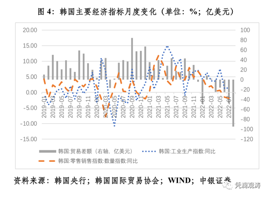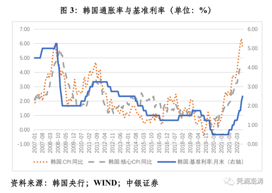 韩国CPI通胀自去年4月份起持续超过2%的中期通胀目标,到今年8月份,CPI同比增长5.7%,核心CPI增长4.4%。韩国央行去年8月份启动了加息周期,领先美联储。到今年8月份,韩国央行连续加息七次,累计达200BP,基准利率为2.50%(见图3)。但由于美国通胀持续爆表、美联储追赶式紧缩,四次加息就追平了韩国。同时,美债收益率飙升,推动韩美利差收敛,今年前八个月,月均10年期韩美国债收益率差缩小30BP(见图2)。特别是6、7月份,美联储前慢后快,两次背对背加息75BP,进一步推高美元指数,加速了韩元贬值。6月初至9月16日,美元指数上涨7.8%,韩元汇率下跌10.7%,日元汇率下跌10.3%(见图1)。