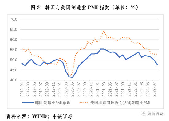 此外,今年6、7月份,韩国工业生产指数同比增速快速下滑,零售销售数量指数连续负增长,货物贸易逆差不断扩大(见图4)。受此影响,5~8月份,韩国制造业PMI指数连续4个月环比下降,且7、8月份连续两个月跌破荣枯线。6~8月份,美国ISM制造业PMI指数虽连续3个月环比下降,却维持在荣枯线以上(见图5)。显然,当前美国经济景气好于韩国,美联储紧缩的底气也强于韩国央行,韩元跌得不冤。