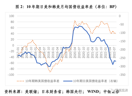 去年起,韩元汇率开始走弱。去年,美元指数反弹6.7%,韩元汇率下跌8.6%,日元汇率下跌10.0%。今年美指进一步走高,到9月16日累计上涨14.3%,韩元与日元汇率继续下跌。去年初至今年9月16日,美元指数累计上涨21.9%,韩元汇率累计贬值21.6%,日元汇率累计贬值27.6%(见图1)。韩元跌幅相对日元要小,主要反映了两国相对美国经济周期和货币政策周期的差异。