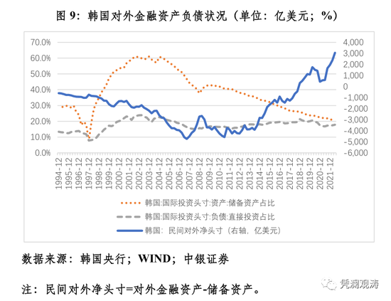 三是民间货币错配大幅改善。2018年三季度末之前,韩国民间长期为对外净负债。随着亚洲金融危机以来,韩国经常项目由逆差转为顺差,在央行积累外汇储备之余,民间也加大了对外投资力度,民间对外净负债先升后降,并从2018年四季度末起转为对外净债权。到今年二季度末,韩国对外金融资产中,储备资产占比为20.6%,较1996年底下降3.5个百分点;剔除储备资产后,韩国民间对外净债权3058亿美元,1996年底为净负债930亿美元。同期,韩国对外金融负债中,直接投资占比17.8%,上升3.9个百分点,显示对外金融负债的稳定性增强(见图9)。
