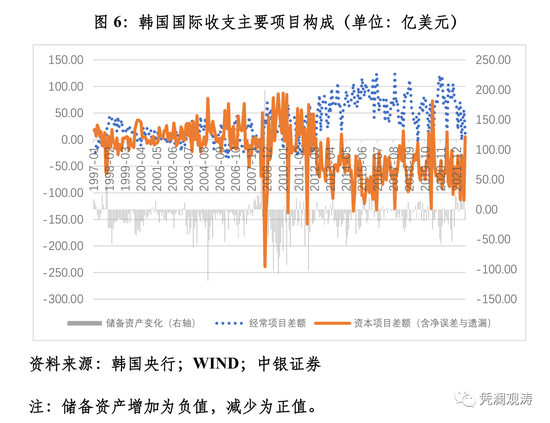 今年韩国也遭遇了资本外流和储备下降。前七个月,韩国经常项目顺差累计259亿美元,同比下降46.7%;资本项目逆差(含净误差与遗漏)403亿美元,增长3.3%;交易引起的储备资产减少144亿美元,去年同期为增加104亿美元。同期,韩国国际储备余额减少245亿美元(其中外汇储备余额减少233亿美元),因美元升值、全球“股汇双杀”产生的负估值效应101亿美元。亚洲金融危机时期的1997年8~12月份,韩国资本项目由前七个月累计净流入130亿转为净流出125亿美元,交易引起的储备资产由累计增加14亿转为减少133亿美元(见图6)。