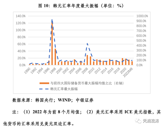 四是韩元汇率弹性明显提高。亚洲金融危机之后,韩元汇率由有管理浮动走向自由浮动。1992~1996年,韩元汇率年度最大振幅平均为4.9%,相当于美元、欧元、日元、英镑前四大国际储备货币汇率年度最大振幅均值的37.5%;2020~2022年前八个月,韩元汇率年度最大振幅平均为14.4%,相当于前述四大国际货币汇率最大振幅均值的106.7%(见图10)。这有助于发挥汇率吸收内外部冲击的“减震器”作用。