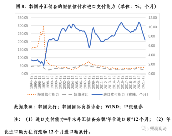 二是国际清偿能力明显增强。从进口支付能力看,到今年二季度末,韩国外汇储备能够满足7.21个月的进口支付需求,远超过不低于3~4个月进口额的低限标准,亚洲金融危机之前韩国该比例通常不到3个月。从短债偿付能力看,同期,韩国短期外债余额仅相当于韩国外汇储备余额的44.4%,远低于不超过100%的国际警戒标准,亚洲金融危机爆发前后的1994年四季度~1998年一季度,该比例平均为197.4%,令当时韩国裸露在市场信心逆转引发的外汇挤兑风潮之下(见图8)。此外,目前韩国央行还同美国、瑞士、中国、澳大利亚、马来西亚、印度尼西亚、阿联酋等国央行签署了合计1963亿美元的货币互换协议,与加拿大央行更是签署了无限额、无期限的互换协议。
