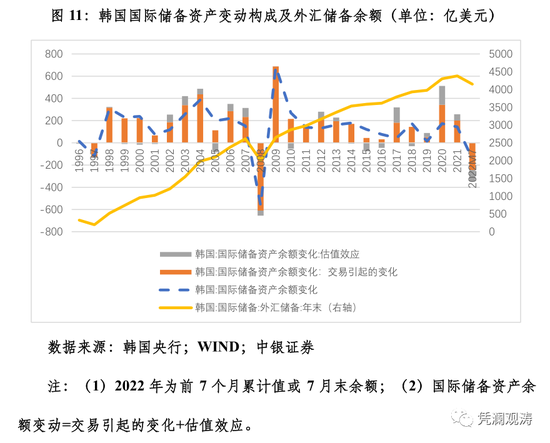 需要指出的是,这无碍韩国汲取亚洲金融危机的教训,通过积累外汇储备,增强自保能力。1998年以来,韩元汇率有涨有跌,但除2008年和今年,韩国国际储备资产余额较上年底有所下降外,其他年份均为环比增加。到今年7月末,国际储备资产余额4386亿美元,较1997年底增加4182亿美元,其中交易引起的储备资产增加3796亿美元,贡献了储备资产增加额的90.8%(见图11)。1999年二季度末~2012年一季度末,韩国对外金融资产中储备资产占比平均为50.4%,较1994年四季度末~1999年三季度末均值上升了24.2个百分点(见图9)。到今年7月末,韩国外汇储备余额4128亿美元,成为全球第七大外汇储备持有者,较1997年底增加3953亿美元,贡献了同期国际储备资产增加额的94.5%(见图11)。韩国外汇储备的积累,既可能来自外汇市场干预,也可能来自储备经营收益。