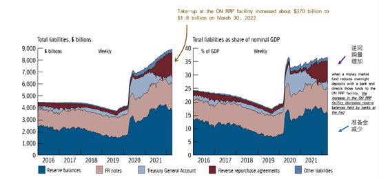 这种情况可以通过图3说明。图3中的左图是美联储负债及主要成分的绝对量,右图是以GDP为分母的相对量。两个图的意义是一样的,只是表达方式不同。右图的蓝色部分是准备金余额,赭石色部分代表“隔夜逆回购便利”存款余额(我们所说的“逆回购量”)。2021年以后“隔夜逆回购便利”存款大幅度增加,原来数量微不足道的“隔夜逆回购便利”存款到2022年3月份增长到1.8万亿美元。从图3可以看出,赭石色部分的增加同蓝色部分的减少是同时发生的。两者在一定程度上对冲了。所以,联储资产负债表上的负债总量并没有因为“逆回购量”的增加而增加。但由于负债总量中商业银行准备金余额的减少,对应的货币政策,至少在理论上,是紧缩而不是放松。