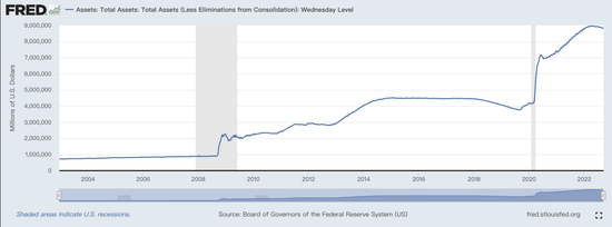 所谓规模不可同日而语是指OMOs涉及的准备金变动有限,而QE则使得联储准备金大幅度增加。联储资产规模由原来的9000亿美元增长到近9万亿美元;尽管已经开始缩表,时至2022年8月联储资产规模依然高达8.8万元美元(图1)。