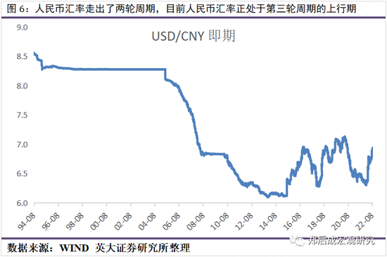 根据以上分析,我们推断人民币汇率贬值总体利空资本市场。第一,人民币汇率贬值利多利率债,其宏观逻辑是,虽然资本外流降低市场水位利空利率债,但是宏观经济承压,以及避险需求上升均利多利率债。第二,人民币汇率贬值对黄金而言是“多空交织”。“多”的因素包括宏观经济承压,以及避险需求上升,“空”的因素包括市场流动性下降。值得指出的有两点:一是全球经济增速对黄金价格的影响,远大于我国经济增速对黄金价格的影响;二是考虑到人民币汇率快速贬值经常伴随美元指数快速上行,而美元指数上行将对黄金价格形成压力。第三,人民币汇率贬值总体利空A股,以及原油、有色、黑色等大宗商品价格。以下我们从实证的角度验证以上判断。2015年“811”汇改以来,人民币汇率走出了两轮周期,目前正处于第三轮周期的上行期。我们具体看: