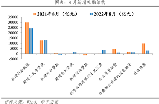 8月存量社融规模337.21万亿元,同比增长10.5%,较上月回落0.2个百分点。新增社会融资规模2.43万亿元,较上年同期少增5571亿元。一方面是去年高基数效应,另一方面反映经济复苏基础不牢,市场融资需求仍待进一步改善。从社融结构来看,主要依靠表外融资支持,政府债券、企业债拖累社融增速。8月社融口径新增人民币贷款1.33万亿元,同比仅多增587亿元;表外融资增加4768亿元,同比多增5826亿元。其中,未贴现的银行承兑汇票增加3485亿元,同比多增3358亿元,监管不鼓励银行票据冲量,银行收票意愿不足。信托贷款减少472亿元,同比少减890亿元,主要受去年低基数效应影响。委托贷款增加1755亿元,同比大幅多增1578亿元,或因多地放款公积金政策,指向公积金贷款需求增加。政府债券净融资3045亿元,同比少增6693亿元;企业债券净融资1148亿元,同比少增3501亿元;新增非金融企业境内股票融资1251亿元,同比少增227亿元,8月国内股市整体呈现震荡态势。