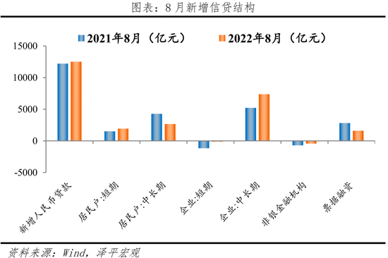 8月金融机构口径信贷余额同比增速为10.9%,较上个月回落0.1个百分点。新增人民币贷款1.25万亿元,同比小幅多增300亿元。结构上,企业贷款整体多增,其中,票据冲量缓解,中长期贷款多增,结构转好。8月新增企业贷款8750亿元,同比多增1787亿元。短期贷款、中长期贷款、票据融资同比分别少减1028亿元、多增2138亿元、少增1222亿元。居民贷款整体少增,其中,短贷多增、中长贷少增。8月居民贷款增加4580亿元,同比少增1175亿元。其中居民短贷增加1922亿元,同比多增426亿元,反映出居民短期消费需求边际改善。居民中长期贷款增加2658亿元,同比少增1601亿元,仍未恢复多增态势。