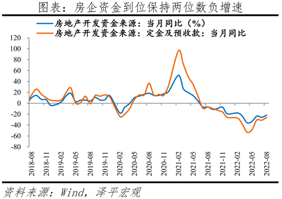 2)房地产销售和投资负增长,是主要拖累项。8月商品房销售面积和销售额同比分别为-22.6%和-28.9%,较上月降幅有所收窄;房地产投资同比增长-13.8%,较上月降幅扩大。房地产开发资金来源同比-21.7%;土地购置面积和土地成交价款同比分别为-56.6%和-41.0%;新开工、施工和竣工面积同比分别为-45.7%、-47.8%和-2.5%,保交付政策提振竣工。