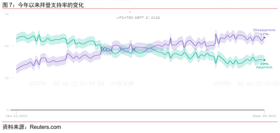 首先,从政治层面讲,中期选举结束或是观察美联储是否出现政策变化的重要时点。尽管从经济层面看,当前美联储没有停止加息的理由,但是疫情以来美联储的操作具有较为明显的政治导向色彩。新冠疫情爆发后,确保经济修复、刺激消费和投资是白宫的首要任务,在此政治纲领下,美联储始终保持鸽派立场,甚至在2021年下半年通胀已经出现快速上行势头时,鲍威尔依然认为通胀是“暂时的”。但是,当鲍威尔在去年11月下旬获得美联储主席连任提名后立即转鹰表示将抗击通胀。今年以来,通胀问题导致拜登政府的支持率快速下降,而出于为中期选举争取更多选票的考虑,美联储也始终维持鹰派立场,鲍威尔在9月Cato Institute研讨会的讲话上也提到,“美联储需要对通胀采取行动以避免通胀带来的社会成本”,这或也包含中期选举的政治含义。在11月上旬中期选举尘埃落定后,美联储是否会出现政策调整值得关注。