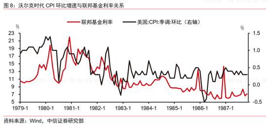 最后,从通胀层面讲,CPI环比增速连续下行或是美联储停止加息的可能因素之一。由于通胀基数逐渐抬升,因此按同比增速测算,美国CPI增速大概率处于逐步下行趋势。当前观测美国通胀情况,CPI的环比增速可能比同比增速更加重要。回顾沃尔克时代,美联储联邦基金利率的走势与美国CPI的环比增速较为吻合,这可能也意味着CPI环比增速的重要性。当前,美联储始终强调需要看到通胀有“证据明确而令人信服(clear and convincing evidence)”的回落,而我们认为其内涵可能是美国CPI的环比增速的连续下降,甚至是CPI环比增速连续出现负增长。因此,从通胀角度看,CPI环比增速连续下行或是本轮美联储停止加息的可能因素之一。