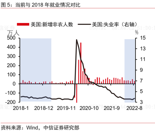在通胀高位运行、就业市场仍然紧俏、美国经济仍有韧性的情况下,预计继续鹰派加息仍是美联储的政策选择,预计本轮加息终点或将到达5%附近。9月点阵图将2022年和2023年联邦基金利率中值预测上调至4.4%和4.6%。尽管点阵图并不代表真实的加息路径,但却传递出美联储维持紧缩立场的决心,短期政策或难以明显转向。当前薪资增速是支撑美国通胀,尤其是核心服务通胀的重要因素。在上世纪70、80年代的高通胀时期,为抑制工资-价格螺旋上涨,美联储在多数时间内维持联邦基金利率水平在非农时薪同比增速之上。当前非农时薪增速同比维持在5%以上,如果以上世纪70、80年代时期作为参照,那么本轮加息终点或将到达5%附近。