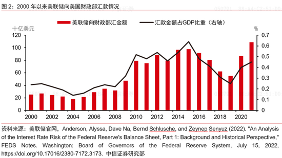 从以上收益与亏损的机制分析中可知,近期市场关注的美联储系统公开市场账户持有证券组合的累计未实现亏损并未影响其获得净收益,关键原因在于美联储系统公开市场账户的未实现亏损并非其实际亏损。