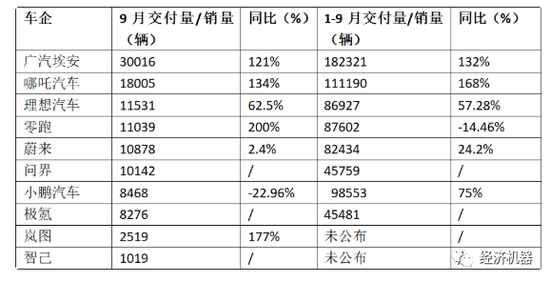 新势力中,零跑汽车9月交付量1.1万辆,同比增长200%,是已公布数据的造车新势力中当月同比增速最快的车企。广汽埃安9月大卖超3万辆,同比增长121%。哪吒汽车交付1.8万辆。而理想汽车凭借L9车型,销量过万,王者归来。小鹏汽车交付量同比下降,主要是芯片短缺和供应链问题。