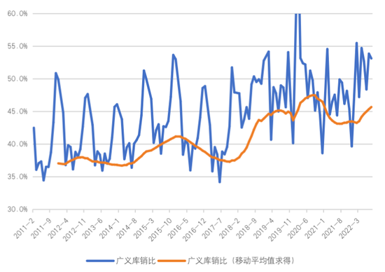 我们构建了“广义库销比”这样一个指标(广义库销比=库存/当月营业收入;2017年之前的营业收入数据用主营业务收入增速倒推得出;1-2月的累计营业收入要除以2),试图用它来反映企业的库存状况。