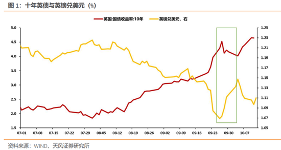 特别是在9月21日至9月27日间,十年英债从3.40%上行113BP至4.53%,英镑兑美元汇率从1.14贬值5.7%至1.07。