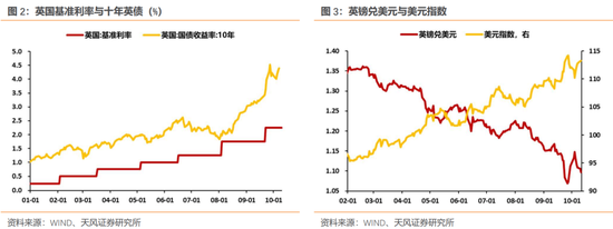 更快的紧缩意味着更高的衰退风险,财政政策与货币政策相背离,也冲击了市场对英国政策的信心。因此加息预期在推升英国国债收益率的同时,英镑兑美元汇率也快速贬值。