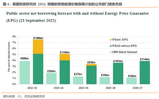 根据IFS估计,新增长计划将使政府债务走上不可持续的上升道路,目前减税需要为了增税或削减开支来填补。而潜在的通胀压力将迫使英国央行以更快加息作为回应。