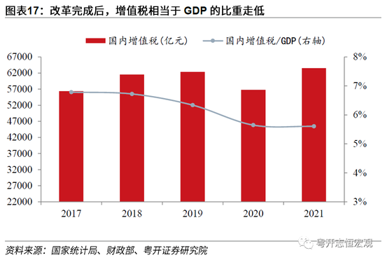 二是完善税制消除重复征税,全面推开增值税改革。近十年,我国增值税改革在三个方面有重要突破。其一,“营改增”全面推开。2012年,“营改增”改革在上海市的交通运输业和部分现代服务业开展试点。2012年9月1日起至年底,试点范围扩大至北京、江苏等省市。2016年试点全面推开,增值税全面替代营业税,营业税退出历史舞台。其二,增值税负大幅降低。2017年取消13%税率,将四档税率简并为三档,2018年、2019年增值税税率连续降低,进项税抵扣范围进一步扩大,并建立了期末留抵退税制度,在基本建立现代增值税制度的同时,实现了所有行业税负“只减不增”。2017年,增值税收入占国内生产总值比为6.8%。2021年,这一比值降低至5.6%,纳税人增值税税收负担大幅降低。其三,增值税出口退税机制改革。2003及2005年,我国两次对出口退税机制进行了改革。2015年,我国进一步调整了出口税收返还政策。改革后出口退税(包括出口货物退增值税和营业税改征增值税出口退税)全部由中央负担,地方将2014年负担的出口退税基数定额上解中央。改革进一步优化了中央与地方收入划分,有效促进外贸稳定发展。