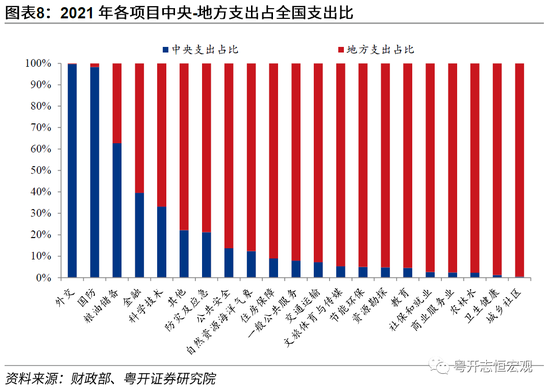 一是中央与地方的事权和支出责任划分更加明晰,中央在维护国家安全、促进全国市场统一等方面发挥主导作用,地方利用信息优势负责区域性公共事务。《国务院关于推进中央与地方财政事权和支出责任划分改革的指导意见》(国发〔2016〕49号)明确了中央事权、地方事权和共同事权,以及相应的支出责任;其后在基本公共服务、卫生、医疗等领域陆续发布相应的事权和支出责任划分改革方案。各级政府间事权和支出责任划分需要充分考虑事权的信息优势、受益范围等综合因素。近年来,中央与地方财政事权和支出责任划分改革分层次多角度发力,从医疗、科技、教育、交通运输、生态环境等方面为解决经济社会发展中的突出矛盾和问题发挥了重要作用。国防、外交等关系到全国的事权由中央行使,城乡事务、医疗卫生、农林水事务等区域性公共服务为地方事权。2021年,中央政府在外交、国防与粮油储备上的支出占该项总支出比例分别为99.7%、98.3%和62.7%。在城乡事务、卫生健康、农林水事务等项目上支出占比较低,为0.4%、1.2%和2.3%。