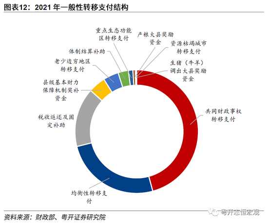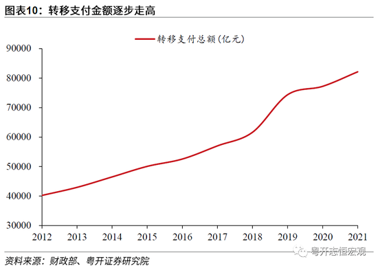 一是转移支付金额逐步走高,中央政府财政调配更为有力,弥补地方政府收支缺口、均衡地区间财力。2012年,中央对地方转移支付总额为40233.6亿元。2021年中央对地方转移支付总额增长为82152.3亿元,几何年均增长率高达8.3%。