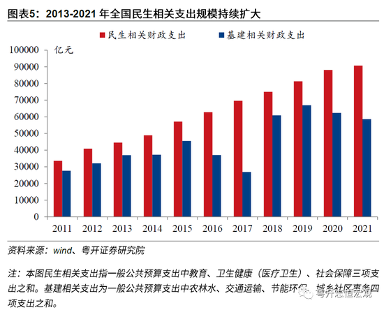 二是支出结构继续优化,落实以人民为中心的发展理念,从基建转向民生,妥善应对城乡差距、老龄化等挑战,扎实推进共同富裕。与教育、卫生、社保相关的民生支出事关人民生活保障,属于财政支出中的“刚性”部分,也是推动缓解人民日益增长的美好生活需要和不平衡不充分的发展之间矛盾的重要推手。十八大以来一般公共预算支出中社保、卫生健康和教育等民生相关支出保持增长,2021年民生领域支出占一般公共预算支出比重为36.8%,较2012年提高4.3个百分点。农林水、城乡社区、交通运输以及节能环保等基建相关支出合计占一般公共预算支出23.8%,较2012年下降1.7个百分点。