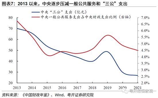 四是中央财政加大对地方政府的转移支付,下沉财力,兜牢“三保”底线。同时压缩政府非必要开支,为减税降费政策腾出空间。党的十八大以来我国大力压减财政一般性支出、严格把控“三公”支出,“政府机关过紧日子”的号召体现了积极财政政策的“节用裕民”:用政府过紧日子省下的“子弹”来为减税降费、“六稳六保”提供财政支持。2020-2021年中央本级支出连续两年负增长,2021年中央本级一般公共预算支出占全国财政支出比重为14.2%,较2012年降低0.7个百分点。