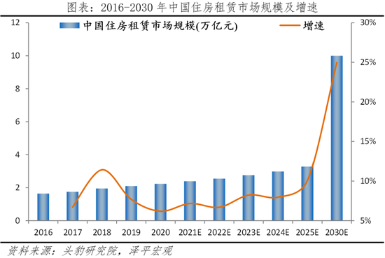 得益于政策支持、存量房时代到来、流动人口支撑等因素,住房租赁市场规模近年来持续增长。根据头豹研究院数据,2016-2020年中国住房租赁市场规模由1.64万亿元增至2.23万亿元,年均复合增长率高达7.9%。随着经济社会的持续发展、整体经济的稳定增长、城镇化进程稳步推进,预计未来中国住房租赁市场规模仍有较大的增长空间,到2025年,行业整体市场规模预计将达到3.28万亿元,2030年,达到10万亿元。