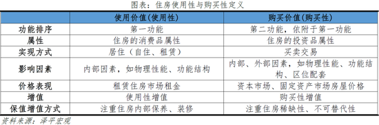 住房兼具投资品和消费品双重属性,消费品属性对应使用价值,即使用性,住房作为消费品实现价值增加,对应使用性增值;投资品属性对应购买价值,即购买性,住房作为投资品实现价值增加,对应购买性增值。
