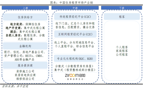 中国住房租赁市场参与方主要包括上游的住房供给方、金融机构、服务供应商,中游的传统租赁经纪平台、互联网租赁经纪平台、专业长租房机构以及下游的住房租赁需求方构成。