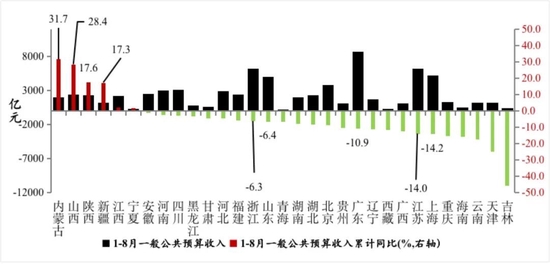 图1:2022年1月-8月各省一般公共预算收入累计值与增速