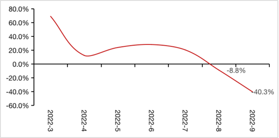 如果不新增债务融资,那么这一缺口将只能由大规模缩减政府性基金支出才能消解。这时,假设一般公共预算减少支出5500亿元、不从其他体系调入资金,那么2022年政府性基金支出将要降预算计划额度减支2.9万亿元降至11.0万亿,较2021年下降3.3%。而由于2022年1-9月政府性基金预算已经支出了8.0万亿元,这意味着2022年第四季度政府性基金支出只能有3万亿元,这将较去年同期下降29.9%。实际上,囿于土地出让收入的锐减,政府性基金预算支出虽然依靠上半年专项债加快发行维持了很强的增长势头,但专项债额度基本用尽后,8月、9月政府性预算支出当月同比增速也开始大幅下降至-8.8%、-40.3%(图7)。如此巨大的降幅将给经济稳定增长带来一定压力。