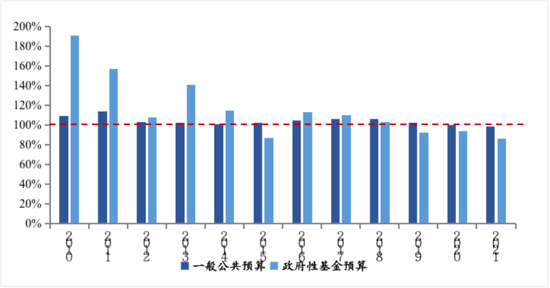 图6:历年预算支出完成度(实际执行支出/预算安排支出)