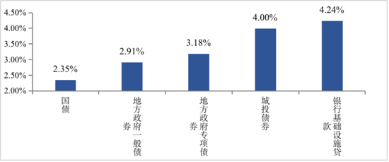 注:1.银行基础设施贷款利率为央行发布的2022年一季度基础设施企业贷款平均利率;2.国债、地方政府债券、城投债券利率,为各自1-7月新增债券的加权平均发行利率。