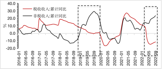 2022年非税收入预计为3.6万亿元。非税收入集中在地方层面(图4)。与税收收入不同,对于政府而言,非税收入的汲取具有一定的“主动性”,当税收减收压力大时,政府部门会尝试从各种途径取得非税收入。最主要的途径是盘活闲置资产、依托矿产资源涨价获取国有资产资源使用收入。2022年税收减收,各级政府在积极通过非税收入增收,1月-9月非税收入累计同比增23.5%,且非税增收力度不断加强。根据历史趋势(图5),我们预计2022年全年非税收入增速与2019年相当,设定为20.2%,则非税收入预计为3.6万亿元。