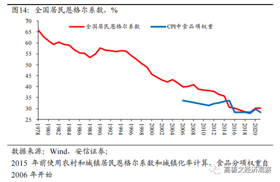 1978年以来,由于中国经济的快速增长和人均收入大幅度上升,食品开支占居民支出比重从65%下降到30%以下,恩格尔系数的显著下降(见图14)反映了生活水平的快速提高。