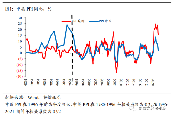 1996年后,中国和美国工业品价格开始表现出极其紧密的联系,相关系数从-0.2上升到0.92。在这26年的时间里,每一轮工业品价格的上升和下跌,在中美之间都是完全同步的,甚至在很多时候顶部和底部幅度都很接近。
