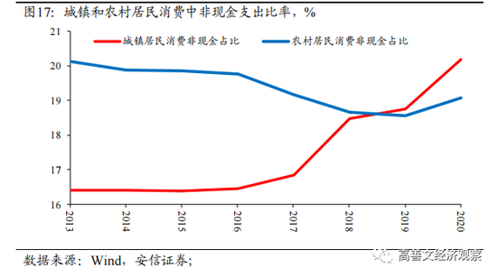 可以看到,2018年后,农村与城镇居民在消费支出中的现金占比基本一致,显示城乡居民消费模式在市场化程度方面基本趋同。