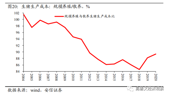 如图20所示,在2008年之前,规模养殖和散养的生产成本基本一致。随后开始快速下降,2014年后,规模养殖的生猪的生产成本稳定在散养的85%左右。这种显著的成本差异,促使散养户卖掉存货和养殖场,其所获得的资金,就进入了储蓄存款。
