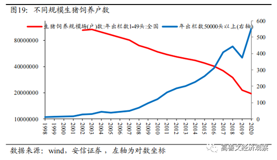 我们假设年出栏数低于50的养殖场户数代表农户小规模散养,年出栏数大于50000头代表用工业化的方法来养猪。