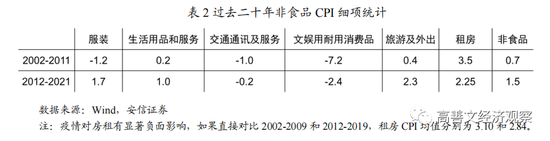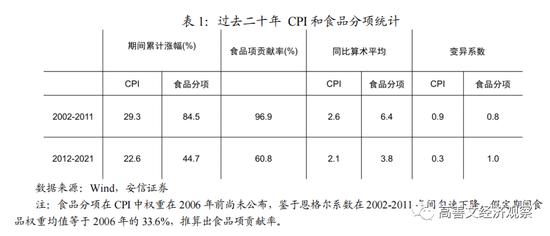 同时,如在表1所显示的那样,在2012年到2021年期间,CPI累计上升了22.6%。其中60%的贡献来自于食品,食品的贡献率从前十年的97%下降到60%,仍然是最大的涨价因素,但影响显著下降。