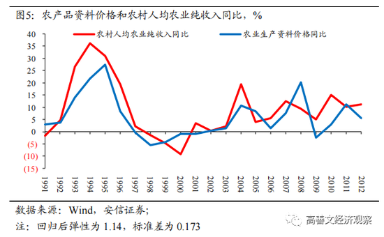 还有一个证据是农村人均来自于农业生产的纯收入,其与农业生产资料价格的弹性为1.14,同样大于1。每一次农业生产资料价格上涨的时候,农户来自于农业生产的收入同样上升,并且上升的幅度更大。这一结果同样不利于成本传导的假说。