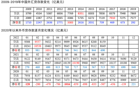 企业对外支付外汇,除来源于留存的涉外收汇外,还可通过增加外汇贷款获取外汇。2009年以来全社会外汇贷款与外汇存款余额变化情况如下(存贷差额变化很明显,由2020年底前的净贷差转变为之后的净存差):