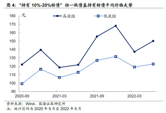 最终,我们发现低波组“固收+转债”基金持有的转债价格显著低于高波组基金。然而,实际上,“低价”并不是这些基金选择转债标的唯一标准。以“持有 10%-20%转债”一档基金为例,即便是低波组基金,持有转债的平均价格中枢长期在 120 元上下进行波动,也并非“绝对低价”。
