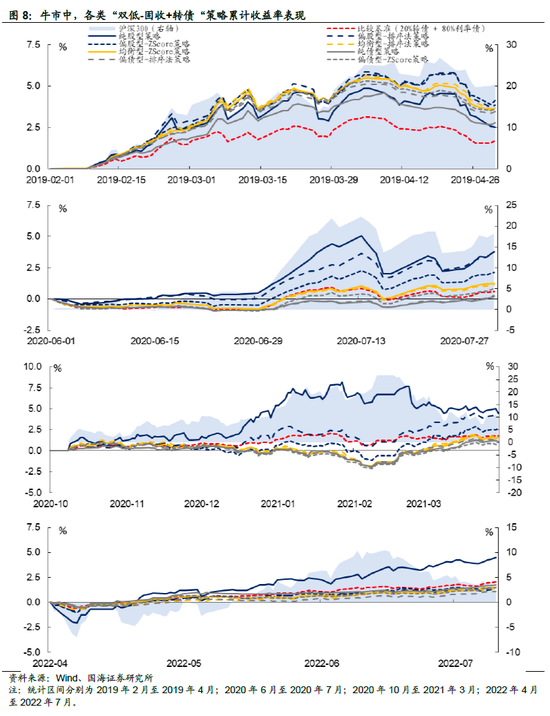 2)牛市中,纯股和偏股型“双低”策略表现更优。与熊市中的表现恰恰相反,牛市中各策略的整体收益情况表现为:纯股(偏股)型 > 均衡型 > 纯债(偏债)型。这主要得益于纯股(偏股)型策略往往能在牛市中体现出其收益弹性的优势。并且,“纯股型”策略表现显著好于其他偏股型策略。