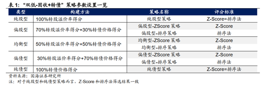 调仓日前一个交易日:对转债池内转债从“价格”和“转股溢价率”两大维度进行打分(Z-Score或排序法),并对两项得分加权求得总分(五类策略)。最终,取得分最低的 20 只转债进行等权配置。