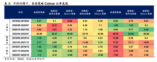 中周期来看,以上各策略在不同市场行情下,也呈现类似规律: